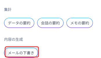 - 利用開始: メールの作成画面、メモ欄、データの詳細画面などに表示される「AIアイコン」をクリックして使用します。