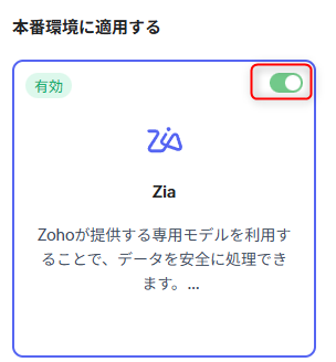 - AIの有効化: スマートプロンプトに使用するAI「Zia」を選択し、有効化します。