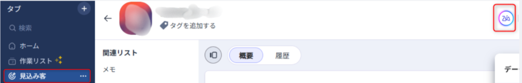 「見込み客」や「取引先」などから顧客データにアクセスし、右上にある「Zia」アイコンをクリック。
