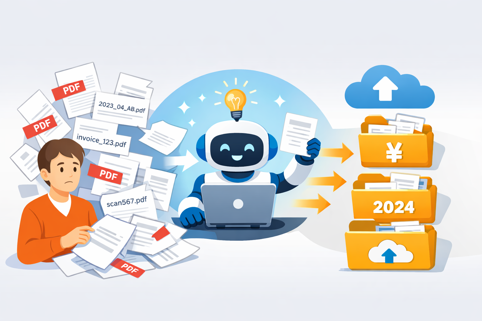毎月届く請求書PDFを会社の命名規則に沿ってリネームし、クラウドストレージの所定フォルダに仕分けする。